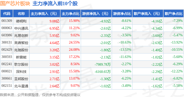 从资金流向上来看,当日国产芯片板块主力资金净流入41.65亿元,游资资金净流出34.72亿元,散户资金净流出6.93亿元。国产芯片板块个股资金流向见下表: