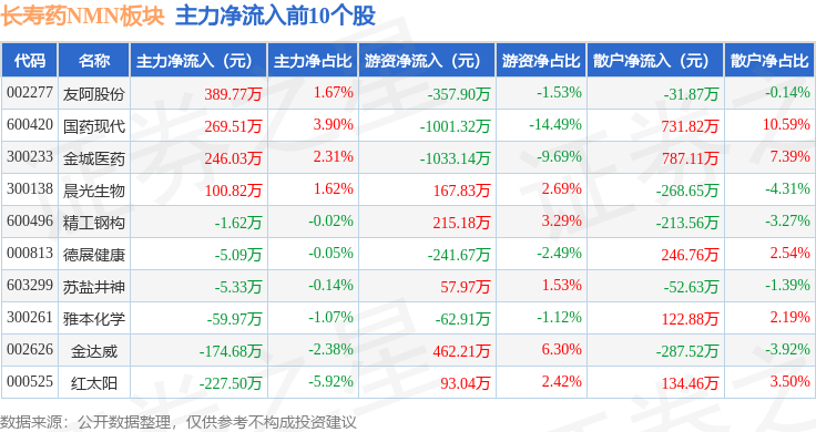 从资金流向上来看,当日长寿药NMN板块主力资金净流出1.63亿元,游资资金净流入2960.5万元,散户资金净流入1.34亿元。长寿药NMN板块个股资金流向见下表: