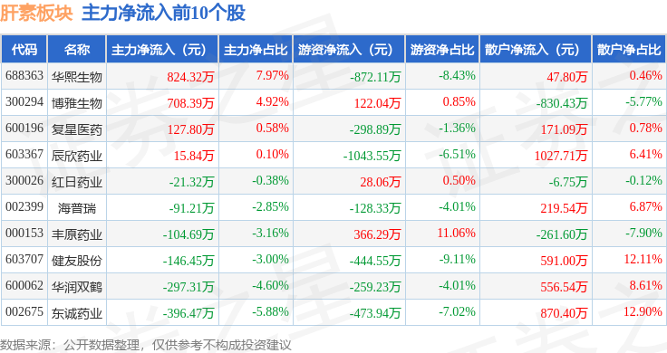 从资金流向上来看,当日肝素板块主力资金净流出5258.31万元,游资资金净流出947.93万元,散户资金净流入6206.24万元。肝素板块个股资金流向见下表:
