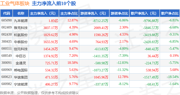 从资金流向上来看,当日工业气体板块主力资金净流入7231.78万元,游资资金净流出9141.53万元,散户资金净流入1909.75万元。工业气体板块个股资金流向见下表: