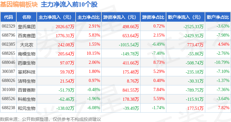 从资金流向上来看,当日基因编辑板块主力资金净流出1.39亿元,游资资金净流入6693.3万元,散户资金净流入7214.0万元。基因编辑板块个股资金流向见下表: