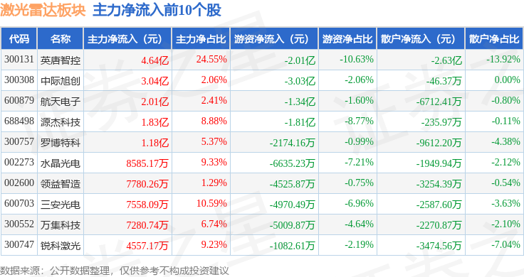 从资金流向上来看,当日激光雷达板块主力资金净流出6.84亿元,游资资金净流入6792.34万元,散户资金净流入6.16亿元。激光雷达板块个股资金流向见下表: