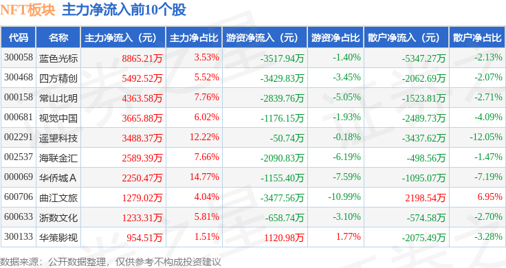 从资金流向上来看,当日NFT板块主力资金净流出6.38亿元,游资资金净流入166.35万元,散户资金净流入6.36亿元。NFT板块个股资金流向见下表: