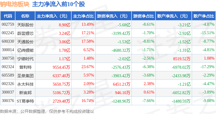 从资金流向上来看,当日钠电池板块主力资金净流入11.85亿元,游资资金净流出13.97亿元,散户资金净流入2.13亿元。钠电池板块个股资金流向见下表: