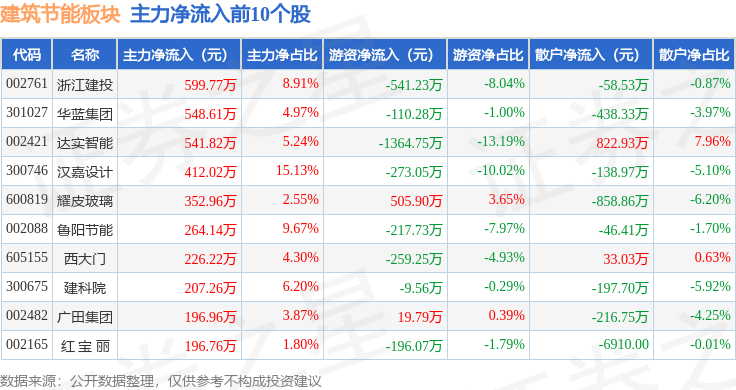 从资金流向上来看,当日建筑节能板块主力资金净流出3.99亿元,游资资金净流出422.8万元,散户资金净流入4.03亿元。建筑节能板块个股资金流向见下表: