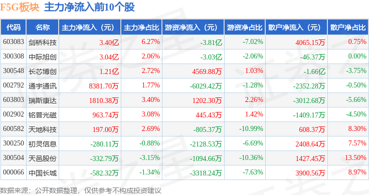 从资金流向上来看,当日F5G板块主力资金净流入7.75亿元,游资资金净流出7.21亿元,散户资金净流出5438.1万元。F5G板块个股资金流向见下表:
