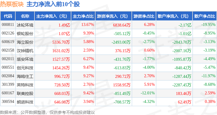 从资金流向上来看,当日热泵板块主力资金净流出2.03亿元,游资资金净流入5505.59万元,散户资金净流入1.48亿元。热泵板块个股资金流向见下表: