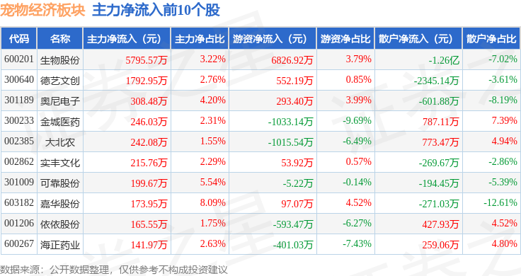 从资金流向上来看,当日宠物经济板块主力资金净流出1.99亿元,游资资金净流入1.31亿元,散户资金净流入6769.82万元。宠物经济板块个股资金流向见下表: