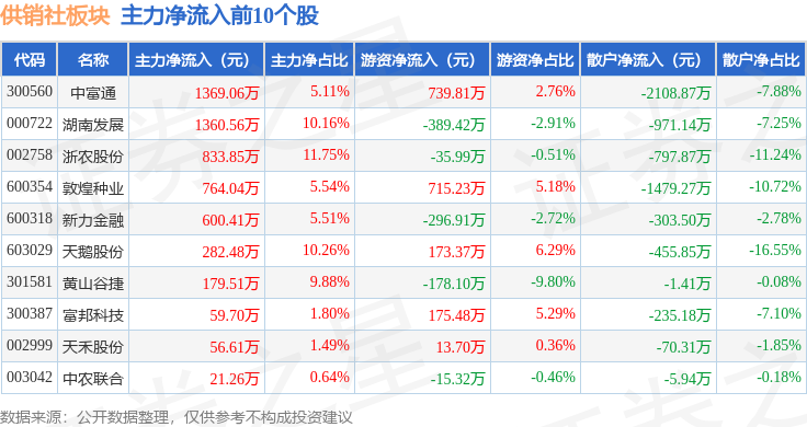 从资金流向上来看,当日供销社板块主力资金净流出855.88万元,游资资金净流入923.73万元,散户资金净流出67.85万元。供销社板块个股资金流向见下表: