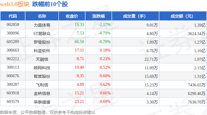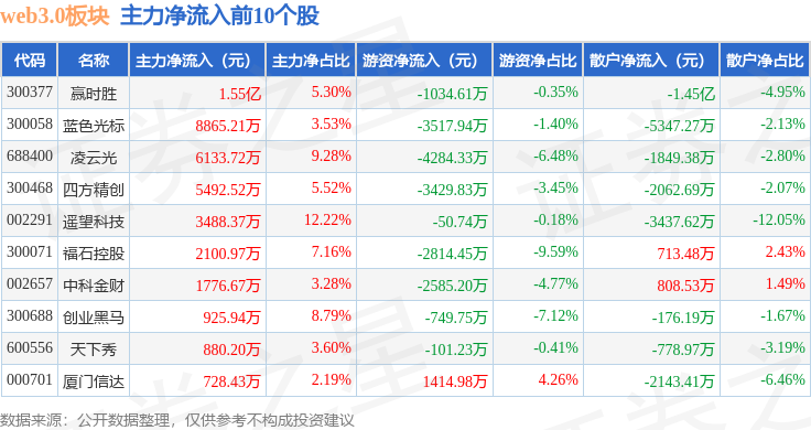 从资金流向上来看,当日web3.0板块主力资金净流入3.39亿元,游资资金净流出2.43亿元,散户资金净流出9621.58万元。web3.0板块个股资金流向见下表: