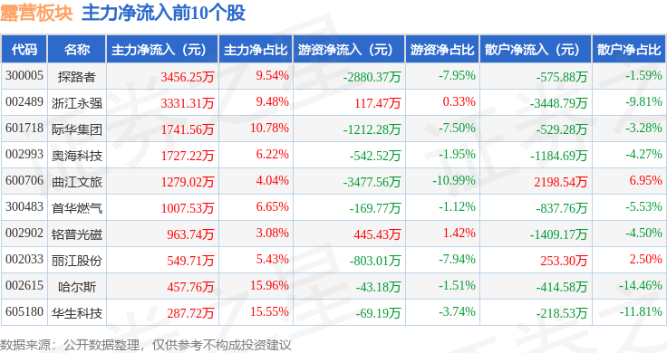 从资金流向上来看,当日露营板块主力资金净流出1.92亿元,游资资金净流出2405.15万元,散户资金净流入2.16亿元。露营板块个股资金流向见下表: