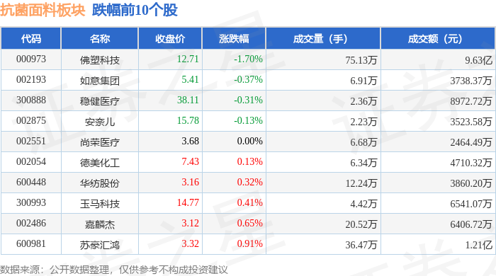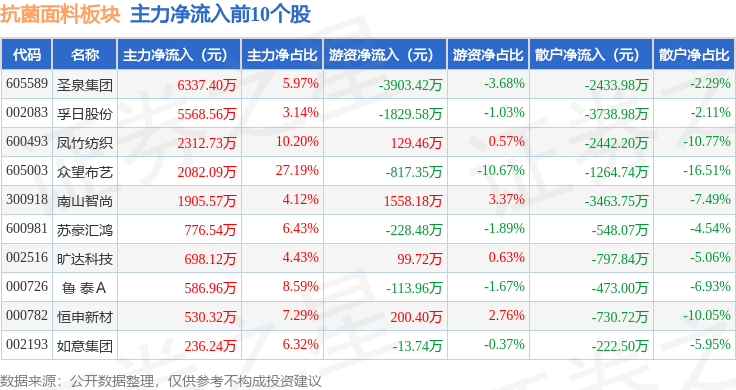 从资金流向上来看,当日抗菌面料板块主力资金净流入4012.58万元,游资资金净流入7105.26万元,散户资金净流出1.11亿元。抗菌面料板块个股资金流向见下表: