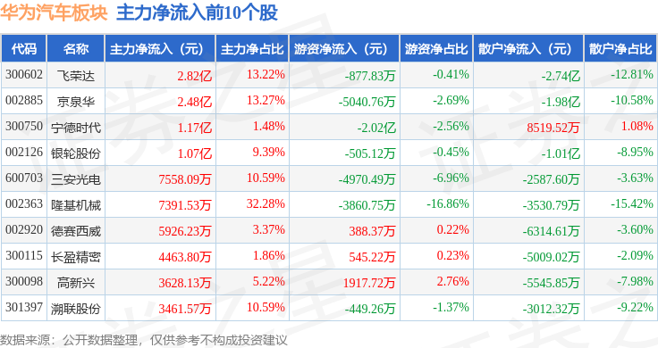 从资金流向上来看,当日华为汽车板块主力资金净流出3.34亿元,游资资金净流出3.77亿元,散户资金净流入7.1亿元。华为汽车板块个股资金流向见下表: