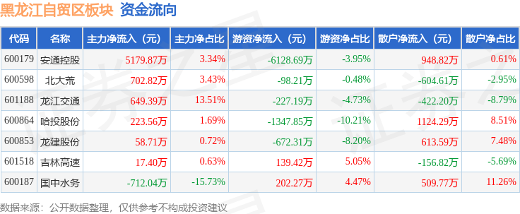 从资金流向上来看,当日黑龙江自贸区板块主力资金净流入6119.73万元,游资资金净流出8132.56万元,散户资金净流入2012.84万元。黑龙江自贸区板块个股资金流向见下表: