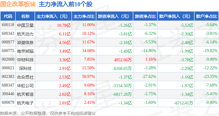 从资金流向上来看,当日国企改革板块主力资金净流入10.93亿元,游资资金净流出43.74亿元,散户资金净流入32.81亿元。国企改革板块个股资金流向见下表: