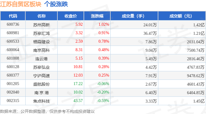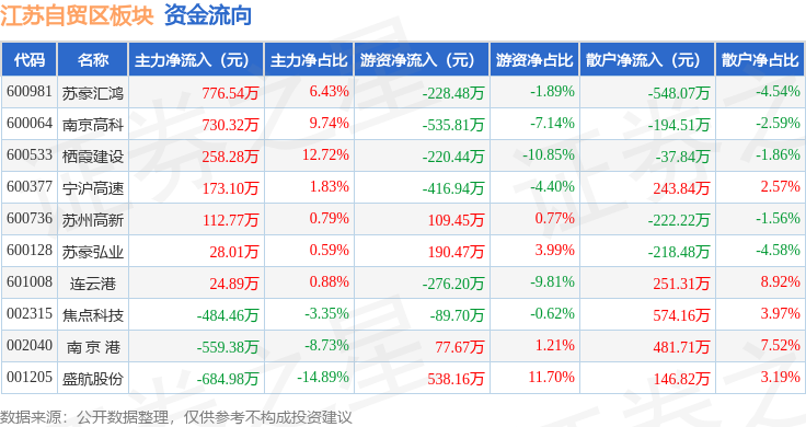 从资金流向上来看,当日江苏自贸区板块主力资金净流入375.11万元,游资资金净流出851.82万元,散户资金净流入476.71万元。江苏自贸区板块个股资金流向见下表: