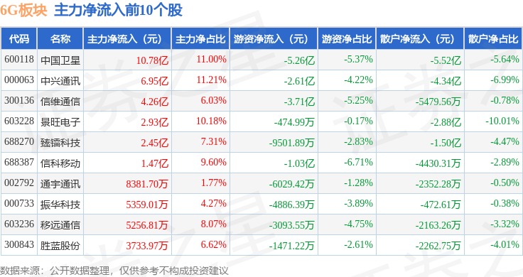 从资金流向上来看,当日6G板块主力资金净流入25.28亿元,游资资金净流出16.95亿元,散户资金净流出8.33亿元。6G板块个股资金流向见下表: