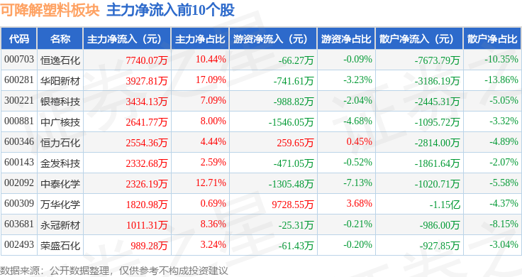 从资金流向上来看,当日可降解塑料板块主力资金净流出1.56亿元,游资资金净流入2612.47万元,散户资金净流入1.29亿元。可降解塑料板块个股资金流向见下表: