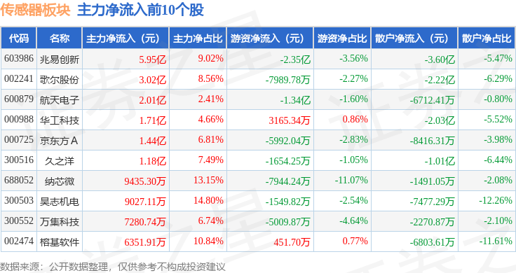 从资金流向上来看,当日传感器板块主力资金净流入8.12亿元,游资资金净流出10.63亿元,散户资金净流入2.51亿元。传感器板块个股资金流向见下表: