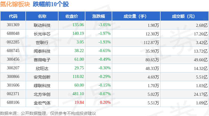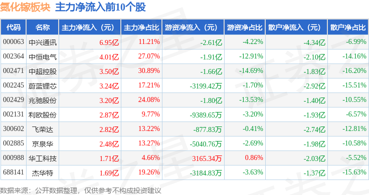 从资金流向上来看,当日氮化镓板块主力资金净流入30.83亿元,游资资金净流出12.31亿元,散户资金净流出18.51亿元。氮化镓板块个股资金流向见下表: