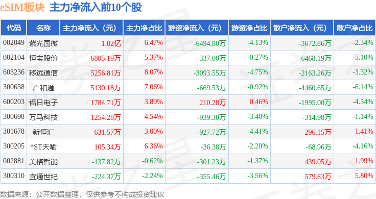 从资金流向上来看,当日eSIM板块主力资金净流入2.67亿元,游资资金净流出1.53亿元,散户资金净流出1.14亿元。eSIM板块个股资金流向见下表: