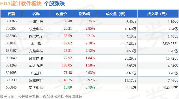 证券之星消息,12月24日EDA设计软件板块较上一交易日上涨1.57%,一博科技领涨。当日上证指数报收于3940.95,上涨0.53%。深证成指报收于13486.42,上涨0.88%。EDA设计软件板块个股涨跌见下表: