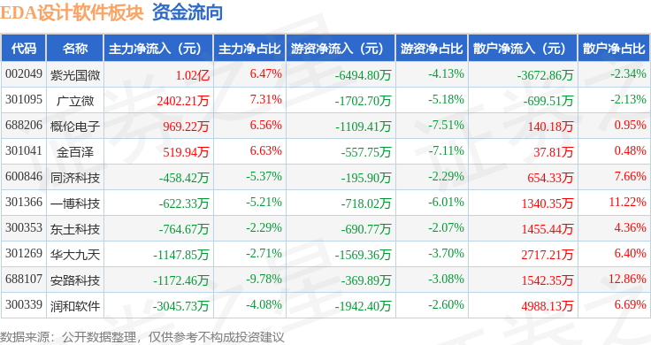 从资金流向上来看,当日EDA设计软件板块主力资金净流入6847.59万元,游资资金净流出1.54亿元,散户资金净流入8503.41万元。EDA设计软件板块个股资金流向见下表: