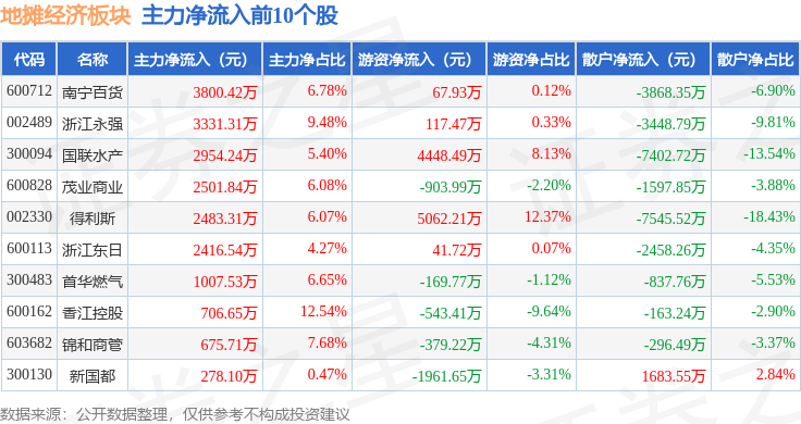 从资金流向上来看,当日地摊经济板块主力资金净流出6.25亿元,游资资金净流入8653.44万元,散户资金净流入5.38亿元。地摊经济板块个股资金流向见下表: