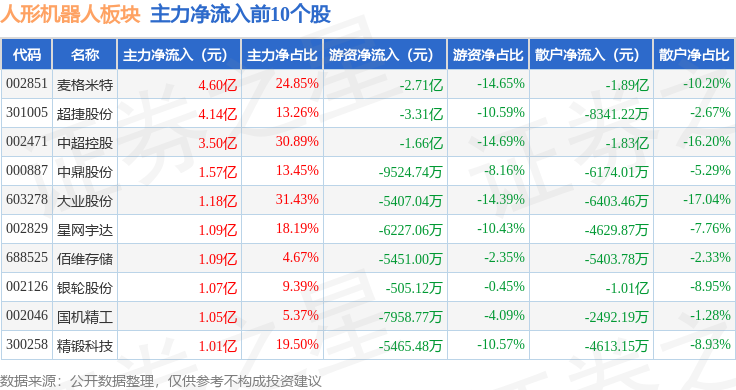 从资金流向上来看,当日人形机器人板块主力资金净流入3.37亿元,游资资金净流出12.08亿元,散户资金净流入8.71亿元。人形机器人板块个股资金流向见下表: