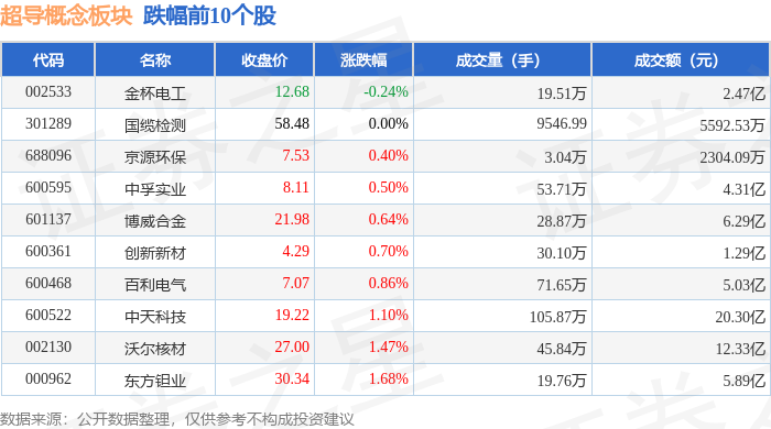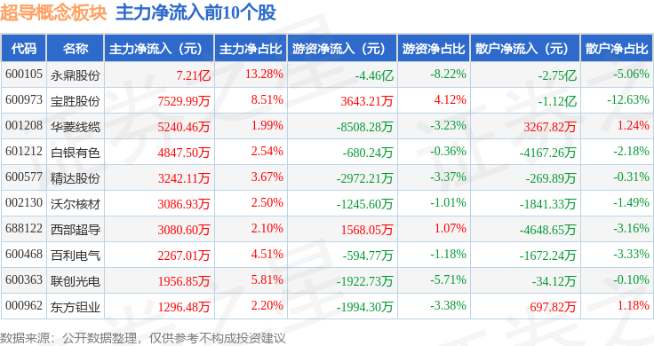 从资金流向上来看,当日超导概念板块主力资金净流入9.39亿元,游资资金净流出5.11亿元,散户资金净流出4.28亿元。超导概念板块个股资金流向见下表: