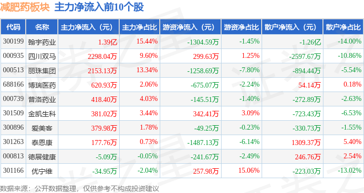 从资金流向上来看,当日减肥药板块主力资金净流出4.61亿元,游资资金净流入1.93亿元,散户资金净流入2.68亿元。减肥药板块个股资金流向见下表: