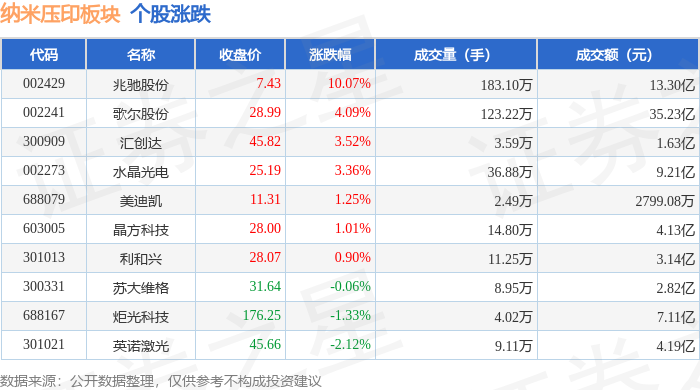 证券之星消息,12月24日纳米压印板块较上一交易日上涨3.68%,兆驰股份领涨。当日上证指数报收于3940.95,上涨0.53%。深证成指报收于13486.42,上涨0.88%。纳米压印板块个股涨跌见下表: