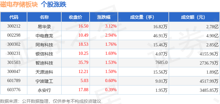 证券之星消息,12月24日磁电存储板块较上一交易日上涨1.92%,易华录领涨。当日上证指数报收于3940.95,上涨0.53%。深证成指报收于13486.42,上涨0.88%。磁电存储板块个股涨跌见下表: