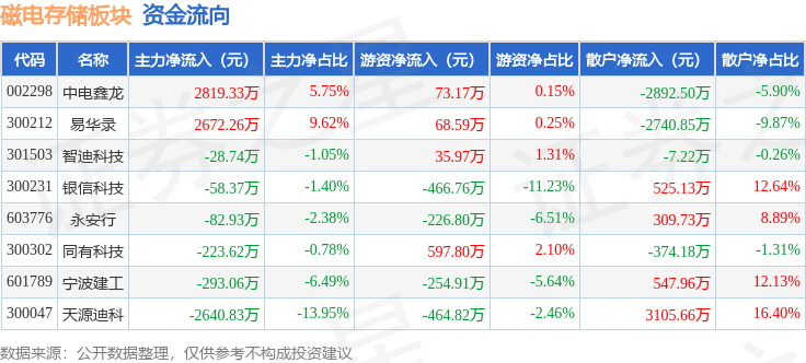 从资金流向上来看,当日磁电存储板块主力资金净流入2164.04万元,游资资金净流出637.77万元,散户资金净流出1526.27万元。磁电存储板块个股资金流向见下表:
