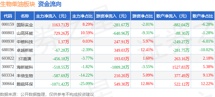 从资金流向上来看,当日生物柴油板块主力资金净流出806.79万元,游资资金净流出382.44万元,散户资金净流入1189.23万元。生物柴油板块个股资金流向见下表: