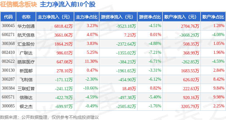 从资金流向上来看,当日征信概念板块主力资金净流入7503.44万元,游资资金净流出2.1亿元,散户资金净流入1.34亿元。征信概念板块个股资金流向见下表: