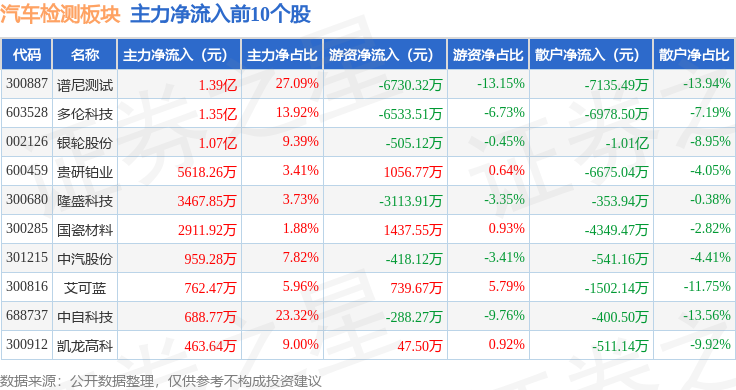 从资金流向上来看,当日汽车检测板块主力资金净流入3.2亿元,游资资金净流入630.87万元,散户资金净流出3.26亿元。汽车检测板块个股资金流向见下表: