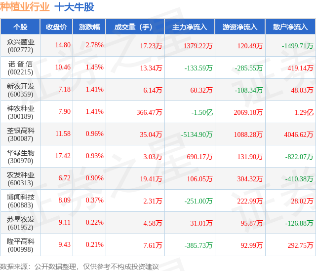 个股表现方面,种植业行业当日领涨股为众兴菌业(002772),该股当日报收14.8,上涨2.78%,成交量17.23万,主力资金净流入1379.22万元。诺 普 信(002215)以上涨1.45%紧随其后,该股当日成交量13.34万,主力资金净流出133.59万元。除此之外,新农开发(600359)、神农种业(300189)、荃银高科(300087)均进入当日牛股之列。具体个股列表见下表: