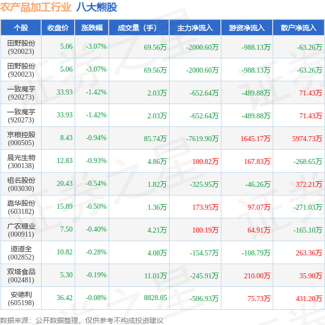 个股表现方面,农产品加工行业当日领跌股为田野股份(920023),该股当日报收5.06,下跌3.07%,成交量69.56万,主力资金净流出2000.6万元。田野股份(920023)以下跌3.07%紧随其后,该股当日成交量69.56万,主力资金净流出2000.6万元。除此之外,一致魔芋(920273)、一致魔芋(920273)、京粮控股(000505)均进入当日熊股之列。具体个股列表见下表: