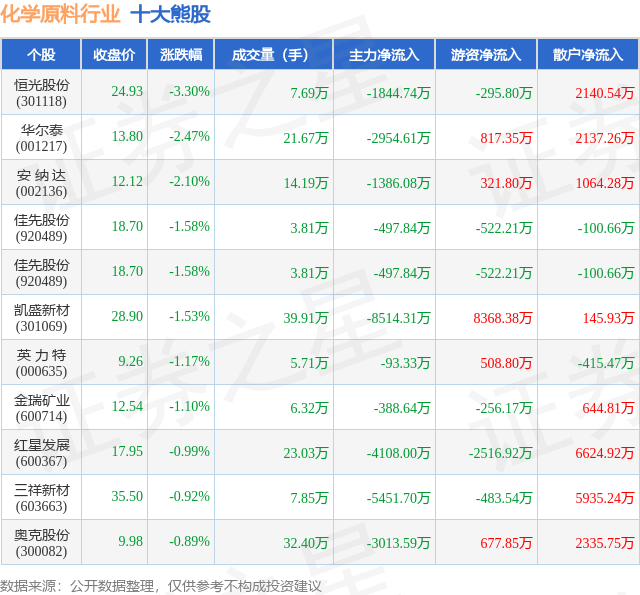 个股表现方面,化学原料行业当日领跌股为恒光股份(301118),该股当日报收24.93,下跌3.3%,成交量7.69万,主力资金净流出1844.74万元。华尔泰(001217)以下跌2.47%紧随其后,该股当日成交量21.67万,主力资金净流出2954.61万元。除此之外,安 纳 达(002136)、佳先股份(920489)、佳先股份(920489)均进入当日熊股之列。具体个股列表见下表: