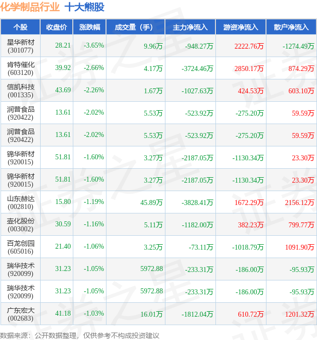 个股表现方面,化学制品行业当日领跌股为星华新材(301077),该股当日报收28.21,下跌3.65%,成交量9.96万,主力资金净流出948.27万元。肯特催化(603120)以下跌2.66%紧随其后,该股当日成交量4.17万,主力资金净流出3724.46万元。除此之外,信凯科技(001335)、润普食品(920422)、润普食品(920422)均进入当日熊股之列。具体个股列表见下表: