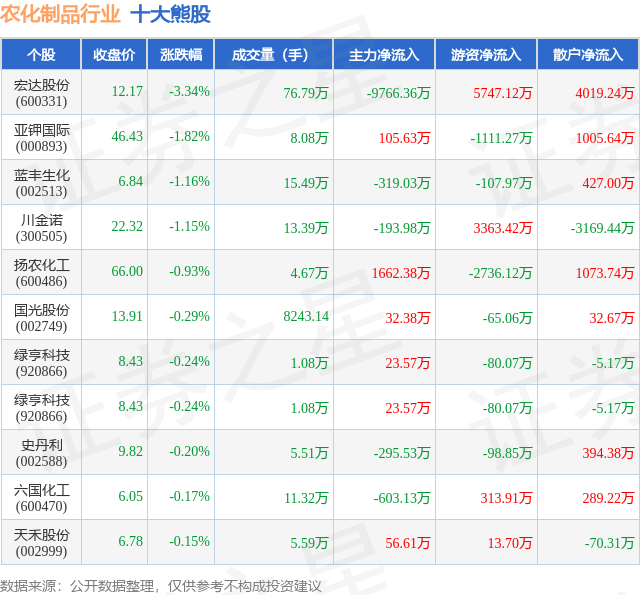 个股表现方面,农化制品行业当日领跌股为宏达股份(600331),该股当日报收12.17,下跌3.34%,成交量76.79万,主力资金净流出9766.36万元。亚钾国际(000893)以下跌1.82%紧随其后,该股当日成交量8.08万,主力资金净流入105.63万元。除此之外,蓝丰生化(002513)、川金诺(300505)、扬农化工(600486)均进入当日熊股之列。具体个股列表见下表: