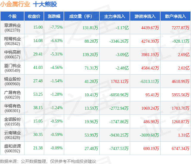 个股表现方面,小金属行业当日领跌股为章源钨业(002378),该股当日报收15.0,下跌7.75%,成交量131.81万,主力资金净流出1.17亿元。翔鹭钨业(002842)以下跌6.63%紧随其后,该股当日成交量88.28万,主力资金净流出3346.26万元。除此之外,中钨高新(000657)、厦门钨业(600549)、锡业股份(000960)均进入当日熊股之列。具体个股列表见下表: