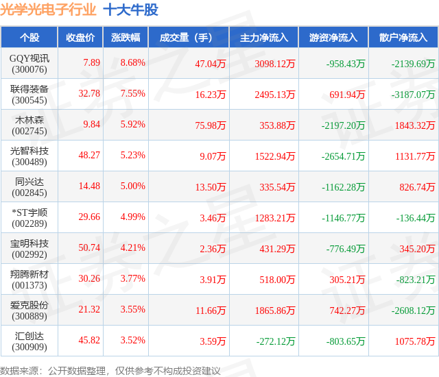 个股表现方面,光学光电子行业当日领涨股为GQY视讯(300076),该股当日报收7.89,上涨8.68%,成交量47.04万,主力资金净流入3098.12万元。联得装备(300545)以上涨7.55%紧随其后,该股当日成交量16.23万,主力资金净流入2495.13万元。除此之外,木林森(002745)、光智科技(300489)、同兴达(002845)均进入当日牛股之列。具体个股列表见下表: