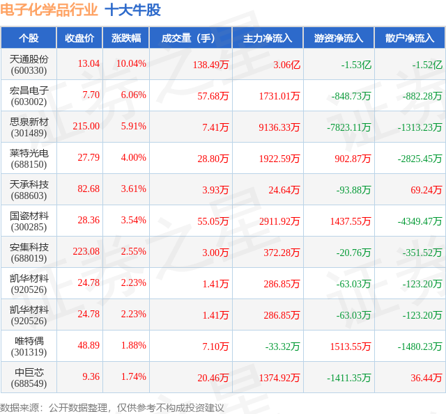 个股表现方面,电子化学品行业当日领涨股为天通股份(600330),该股当日报收13.04,上涨10.04%,成交量138.49万,主力资金净流入3.06亿元。宏昌电子(603002)以上涨6.06%紧随其后,该股当日成交量57.68万,主力资金净流入1731.01万元。除此之外,思泉新材(301489)、莱特光电(688150)、天承科技(688603)均进入当日牛股之列。具体个股列表见下表: