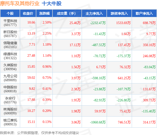 个股表现方面,摩托车及其他行业当日领涨股为千里科技(601777),该股当日报收10.66,上涨2.5%,成交量25.46万,主力资金净流出2232.47万元。新日股份(603787)以上涨2.25%紧随其后,该股当日成交量3.37万,主力资金净流出11.43万元。除此之外,信隆健康(002105)、绿通科技(301322)、久祺股份(300994)均进入当日牛股之列。具体个股列表见下表: