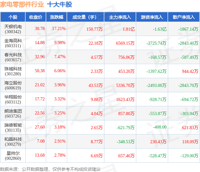 个股表现方面,家电零部件行业当日领涨股为天银机电(300342),该股当日报收30.78,上涨17.21%,成交量150.77万,主力资金净流入1.81亿元。金海高科(603311)以上涨9.98%紧随其后,该股当日成交量22.18万,主力资金净流入6569.15万元。除此之外,春光科技(603657)、珠城科技(301280)、海立股份(600619)均进入当日牛股之列。具体个股列表见下表:
