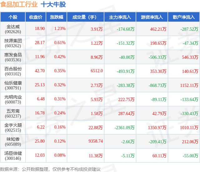 个股表现方面,食品加工行业当日领涨股为金达威(002626),该股当日报收18.9,上涨1.23%,成交量3.91万,主力资金净流出174.68万元。技源集团(603262)以上涨0.61%紧随其后,该股当日成交量1.22万,主力资金净流出151.32万元。除此之外,惠发食品(603536)、百合股份(603102)、仙乐健康(300791)均进入当日牛股之列。具体个股列表见下表: