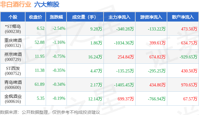 个股表现方面,非白酒行业当日领跌股为*ST椰岛(600238),该股当日报收6.52,下跌2.54%,成交量9.28万,主力资金净流出340.28万元。重庆啤酒(600132)以下跌1.16%紧随其后,该股当日成交量1.86万,主力资金净流出1034.36万元。除此之外,燕京啤酒(000729)、ST西发(000752)、青岛啤酒(600600)均进入当日熊股之列。具体个股列表见下表: