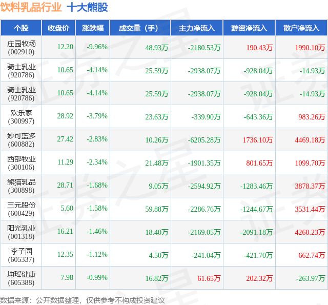 个股表现方面,饮料乳品行业当日领跌股为庄园牧场(002910),该股当日报收12.2,下跌9.96%,成交量48.93万,主力资金净流出2180.53万元。骑士乳业(920786)以下跌4.14%紧随其后,该股当日成交量25.59万,主力资金净流出2938.07万元。除此之外,骑士乳业(920786)、欢乐家(300997)、妙可蓝多(600882)均进入当日熊股之列。具体个股列表见下表: